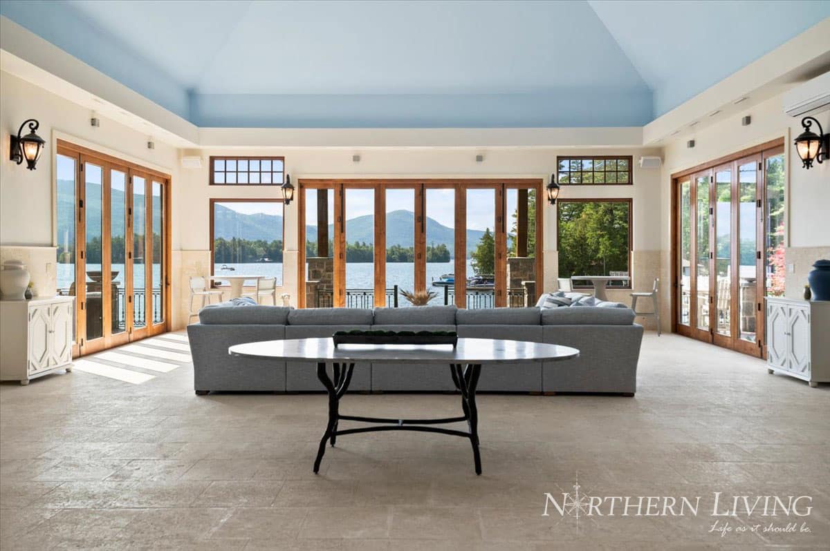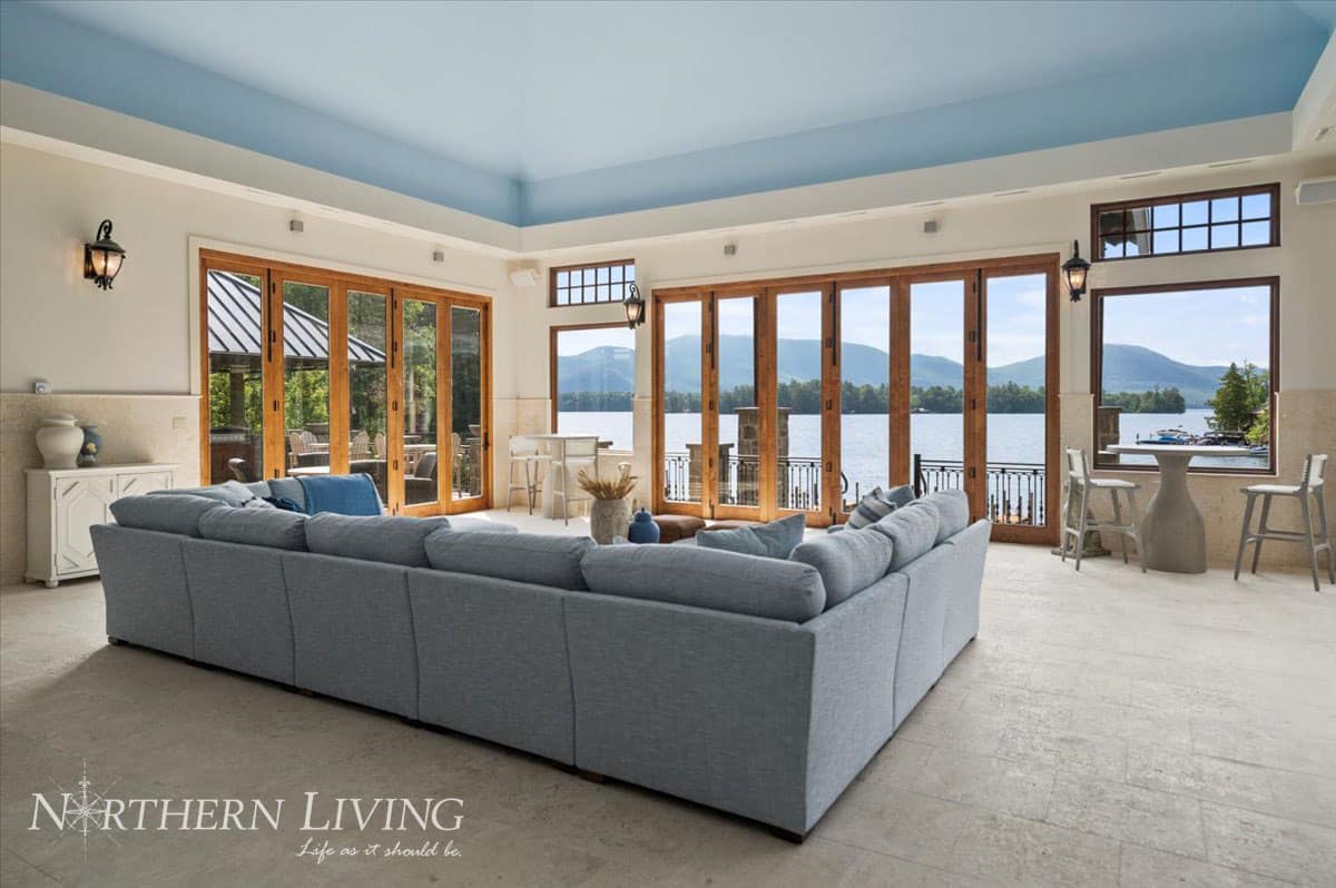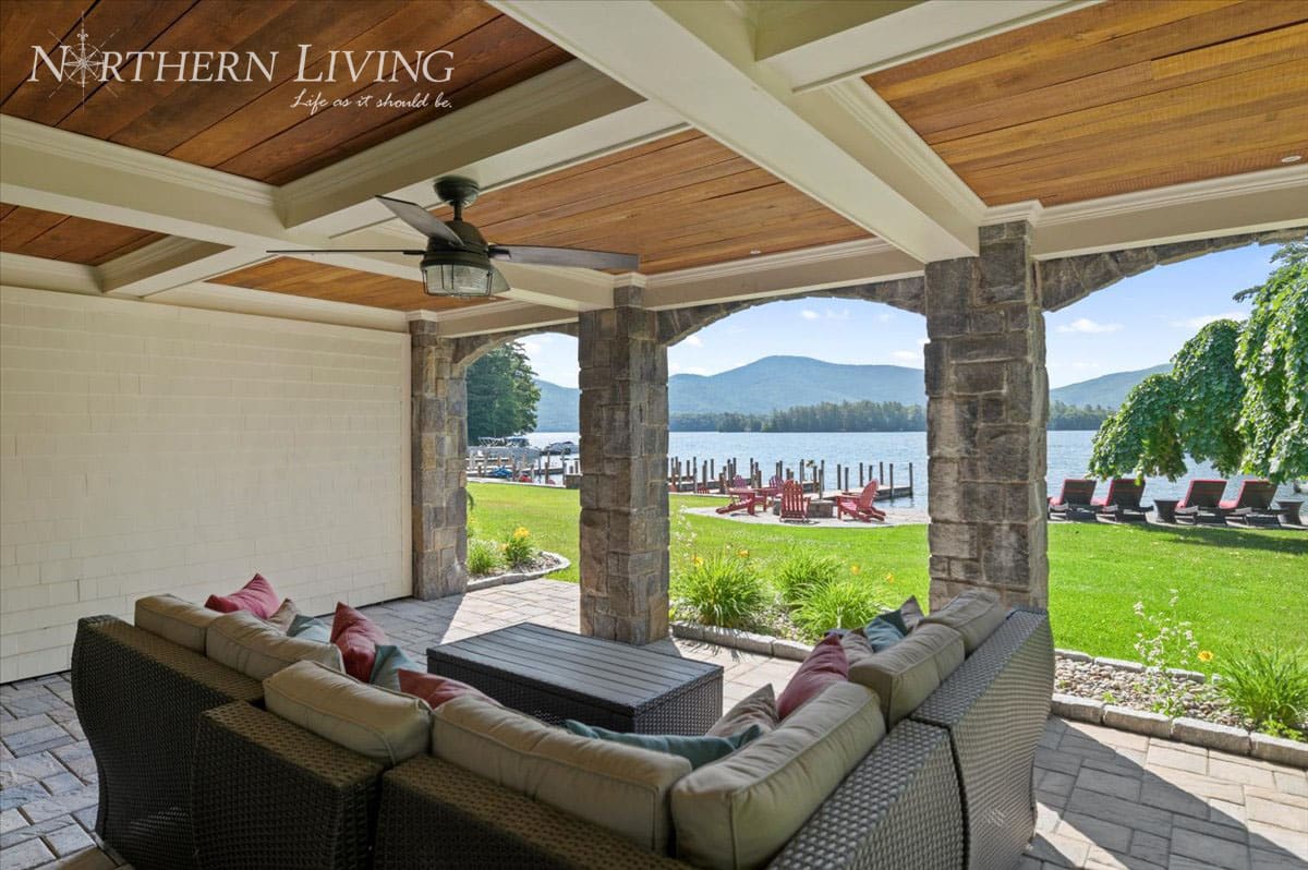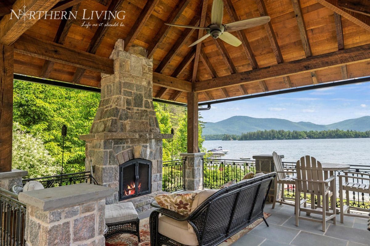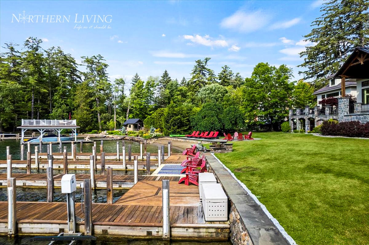 From here, you are steps away from 45 feet of a private beach with Adirondack chairs, loungers, and a paved-seating area off the sandy beach. Enjoy the beautiful Adirondacks while sitting around the custom-made fire pit. Bolton Manor offers direct lake access with dock space for four boats (up to 30′ long), four kayaks, and two paddleboards.
