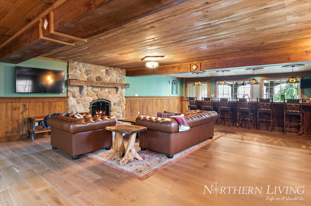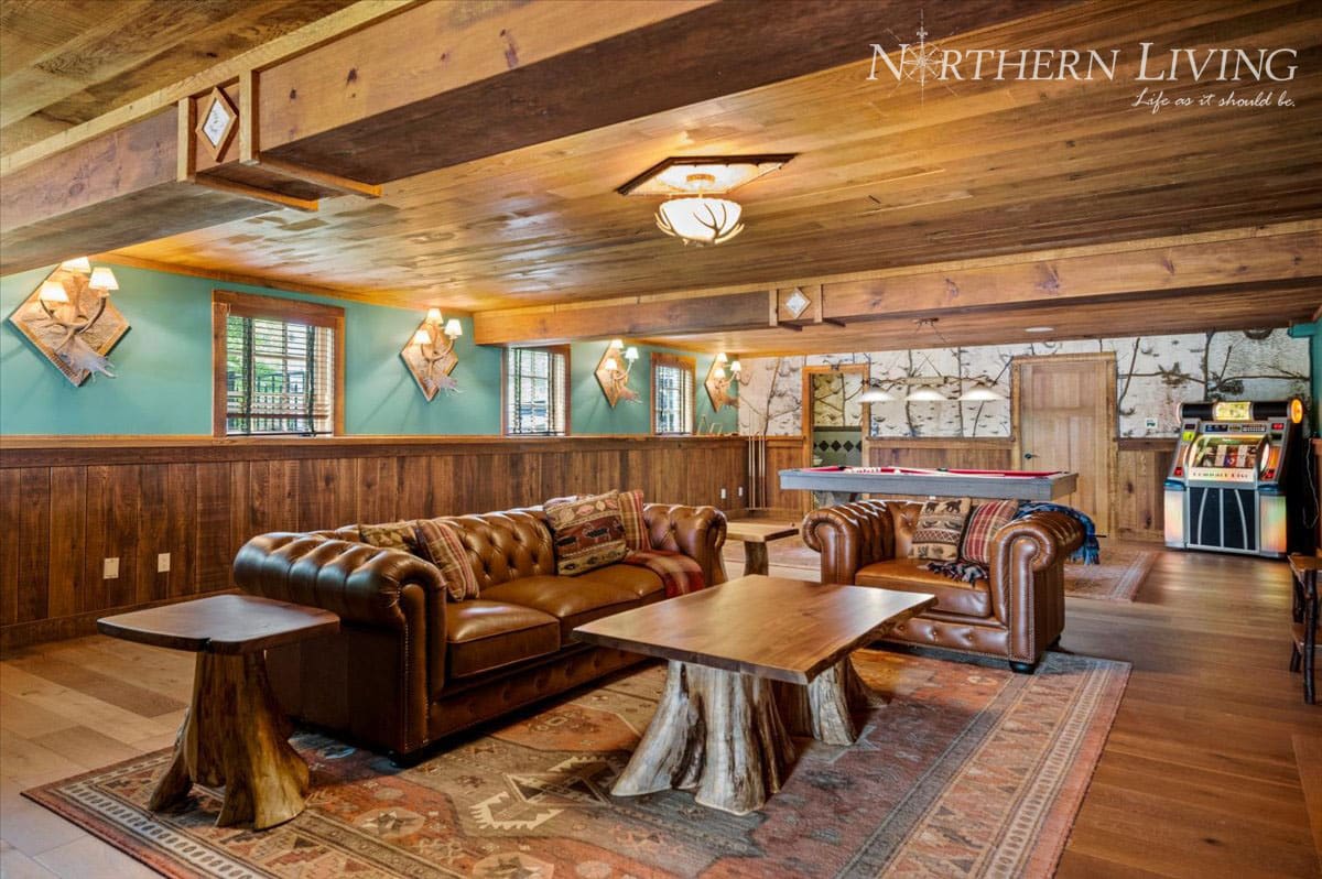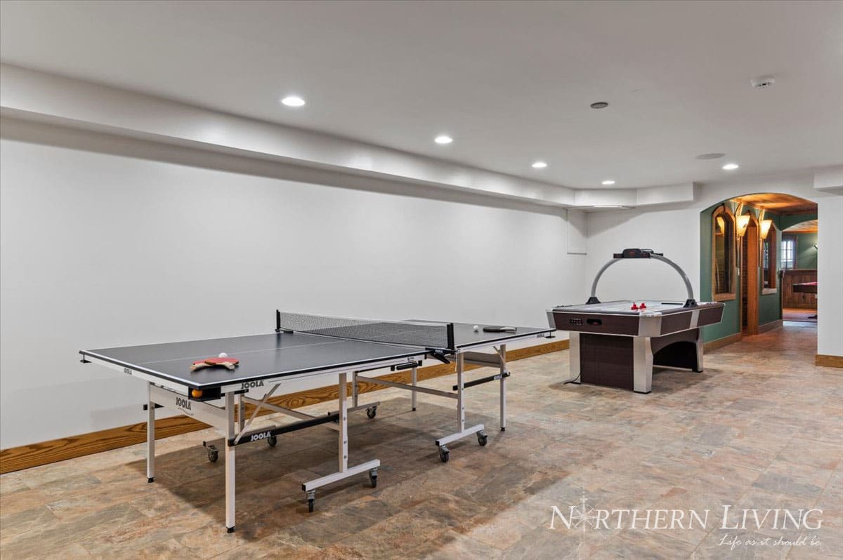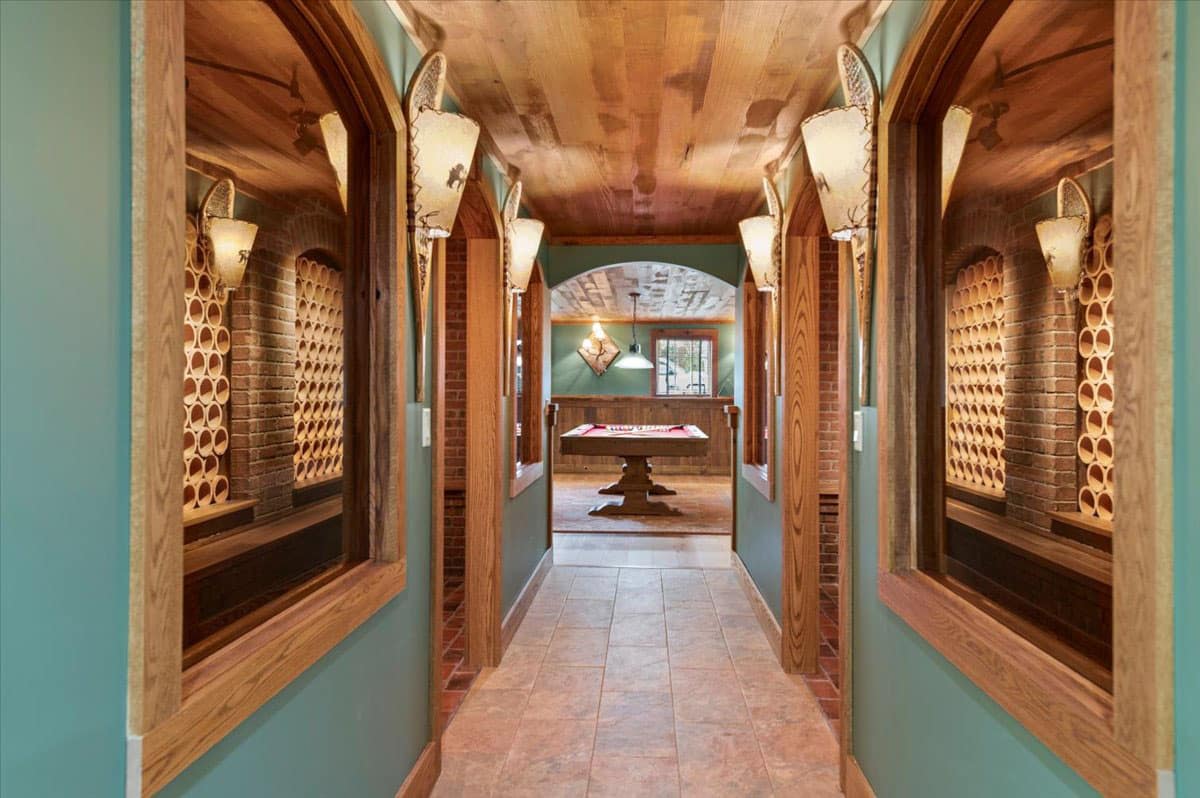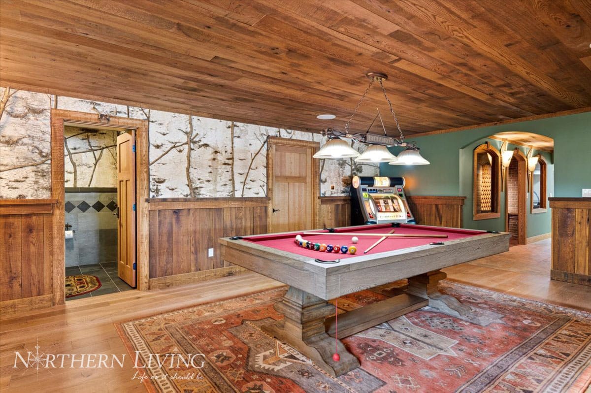 The lake level is the perfect place to spend the day making memories. As you walk down the stairs, you will find a ping pong, air hockey table, and an additional refrigerator. In the North wing of the lake level, there is a movie theater with a mini fridge, a popcorn machine, candy, and eight reclining chairs. As you head to the South wing of the lake level, you will walk through the wine cellar to get to the Adirondack-style pub room, featuring a pool table, jukebox, full bathroom, and living room with a fireplace. The custom-built wooden bar features an ice maker, a wine fridge, a sink, and windows connecting to the outdoor bar so you can serve drinks while lounging outside on the lawn or under the house’s second cabana area.