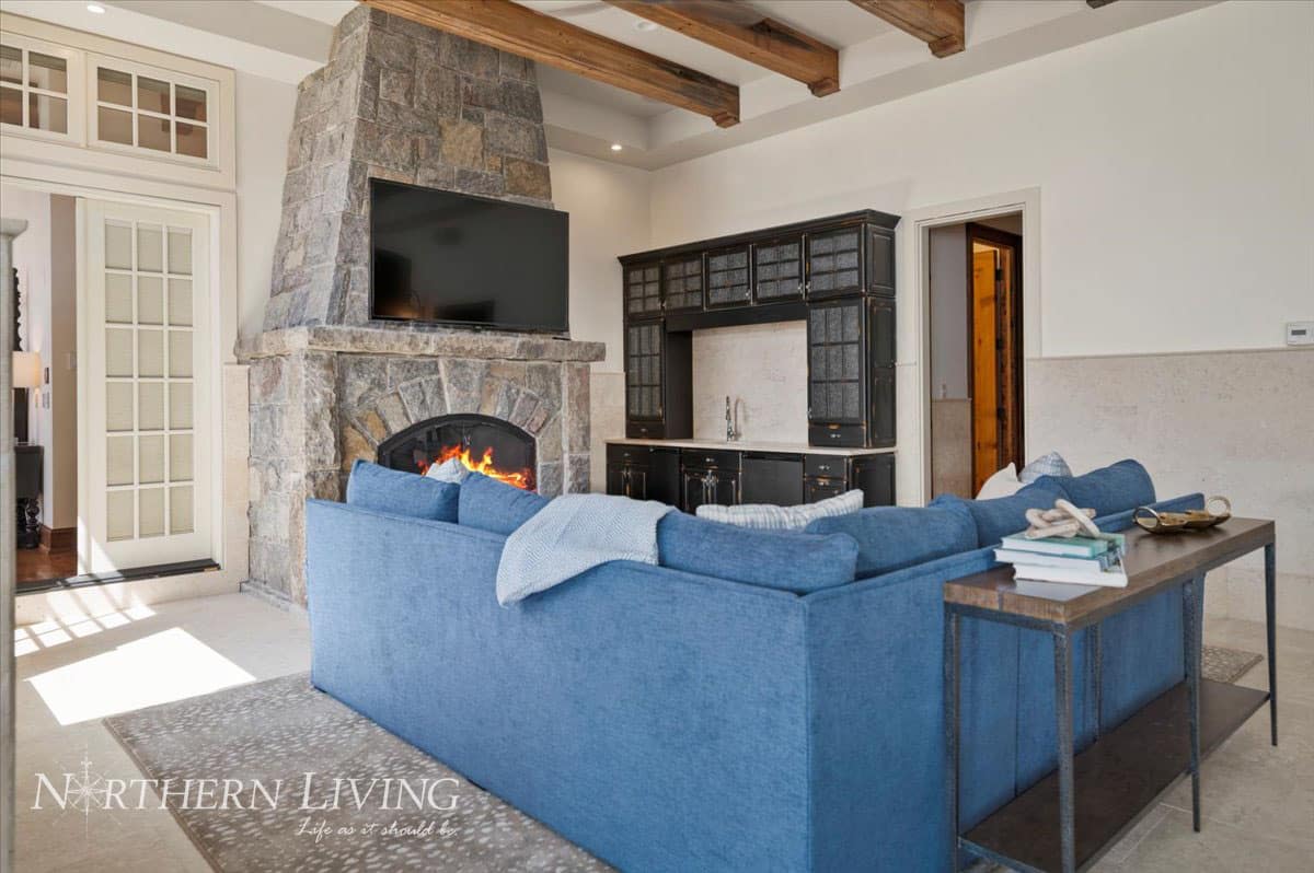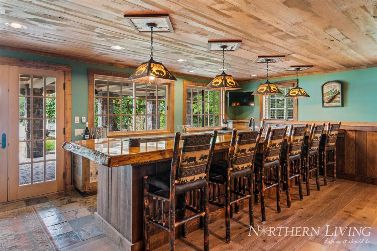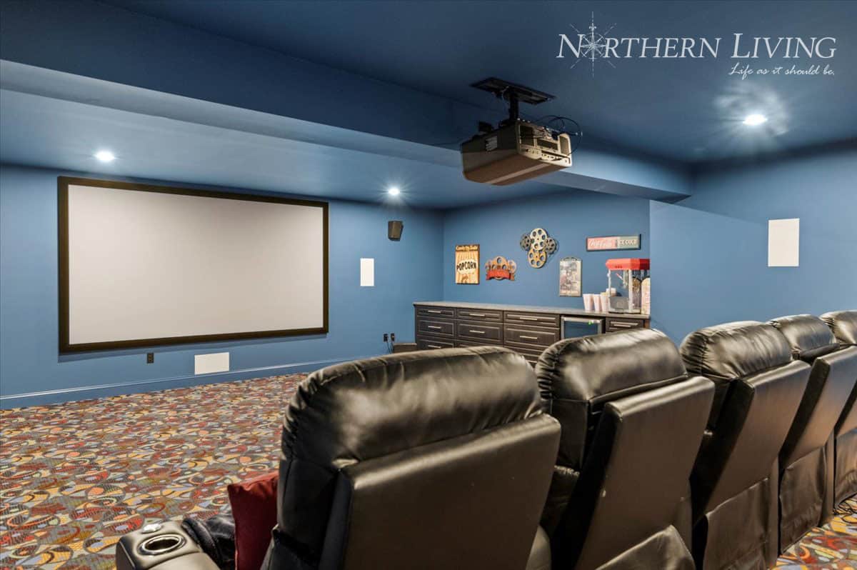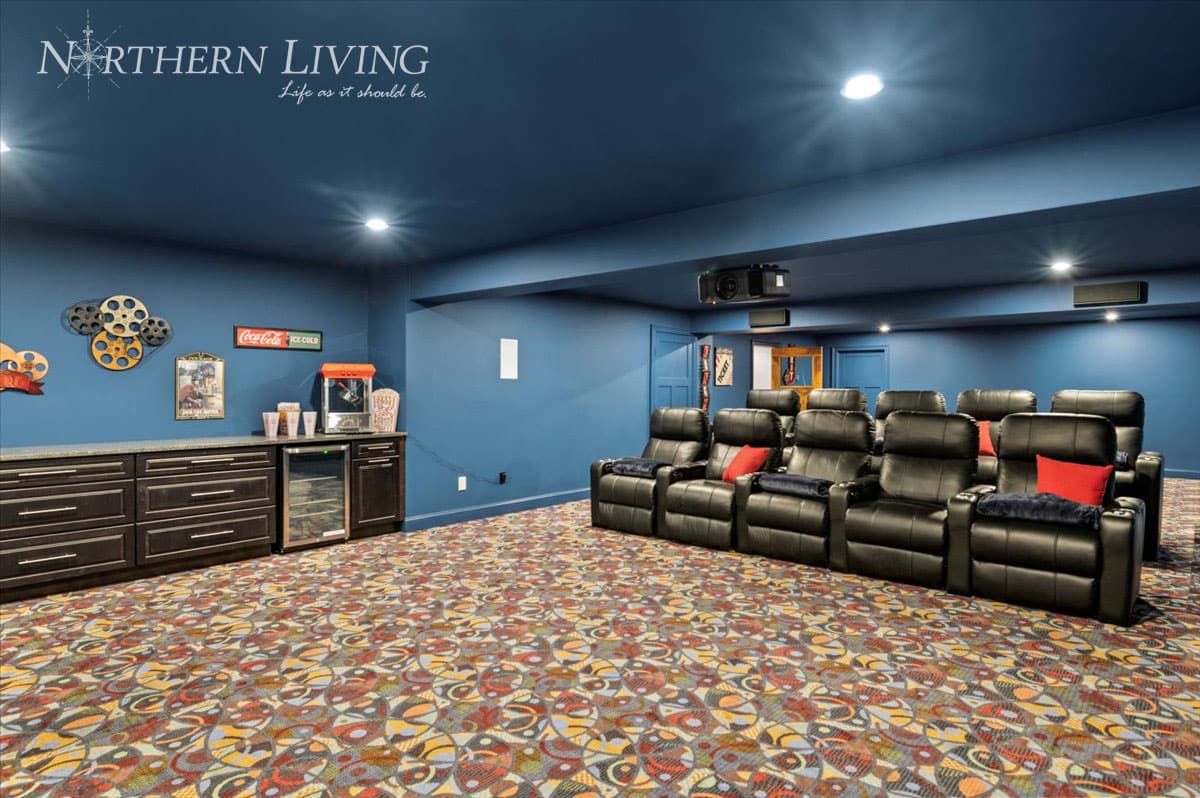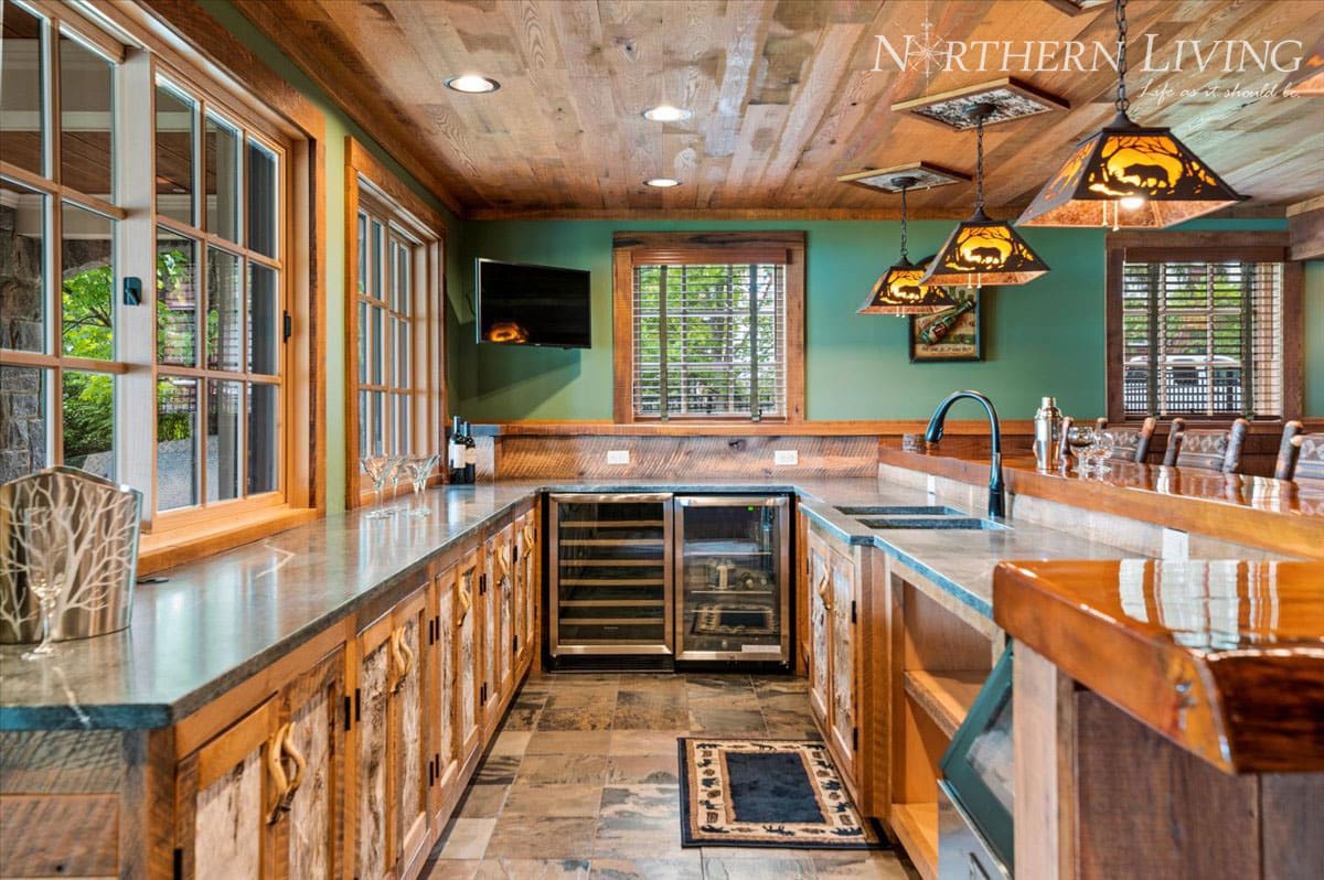 The lake level is the perfect place to spend the day making memories. As you walk down the stairs, you will find a ping pong, air hockey table, and an additional refrigerator. In the North wing of the lake level, there is a movie theater with a mini fridge, a popcorn machine, candy, and eight reclining chairs. As you head to the South wing of the lake level, you will walk through the wine cellar to get to the Adirondack-style pub room, featuring a pool table, jukebox, full bathroom, and living room with a fireplace. The custom-built wooden bar features an ice maker, a wine fridge, a sink, and windows connecting to the outdoor bar so you can serve drinks while lounging outside on the lawn or under the house’s second cabana area.