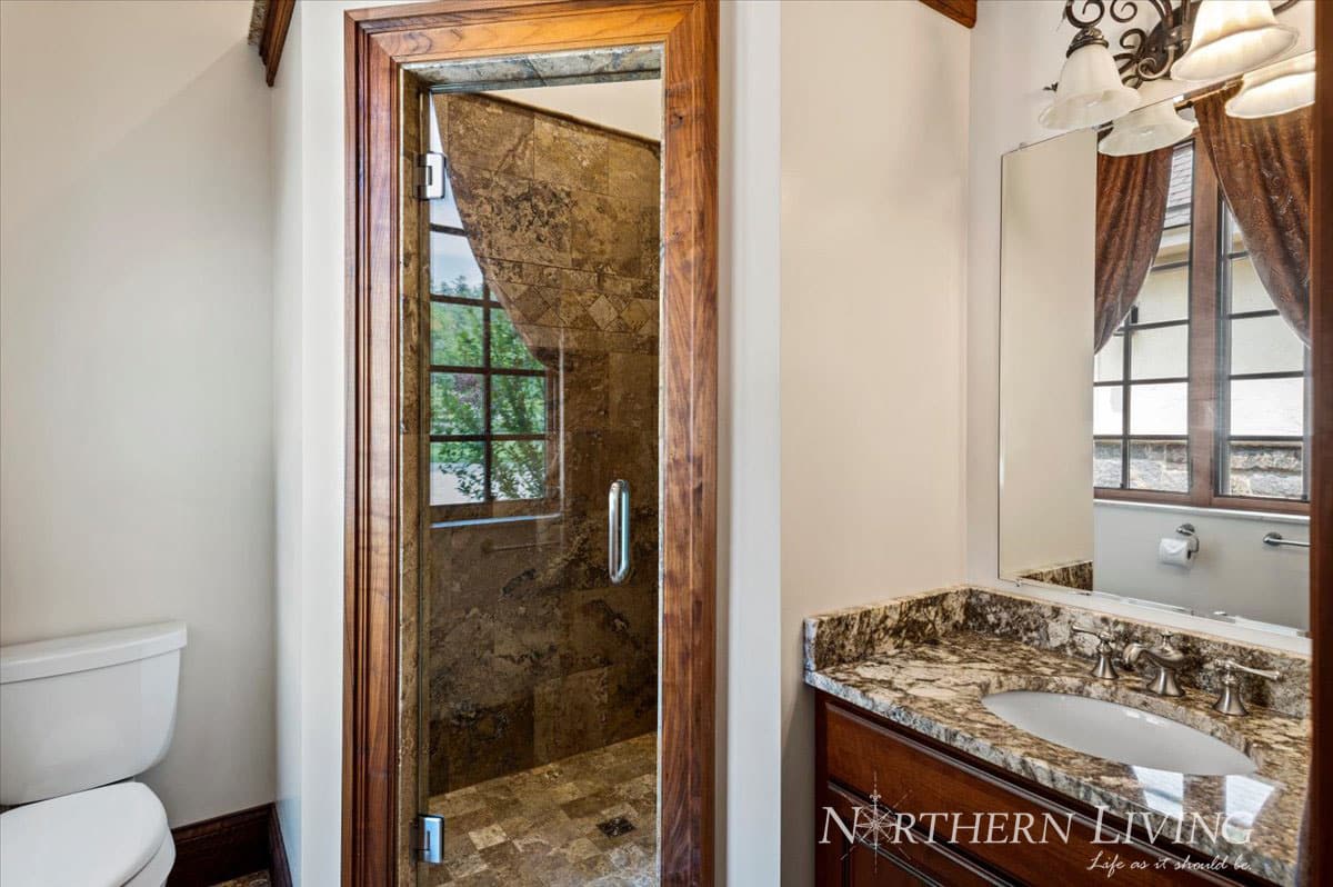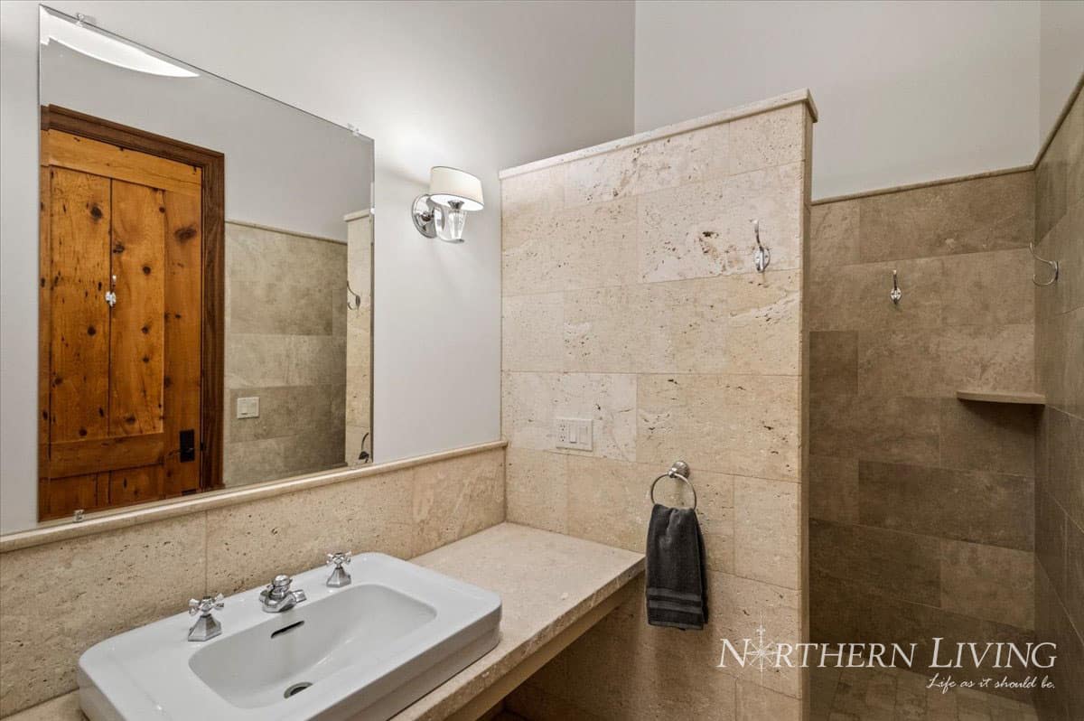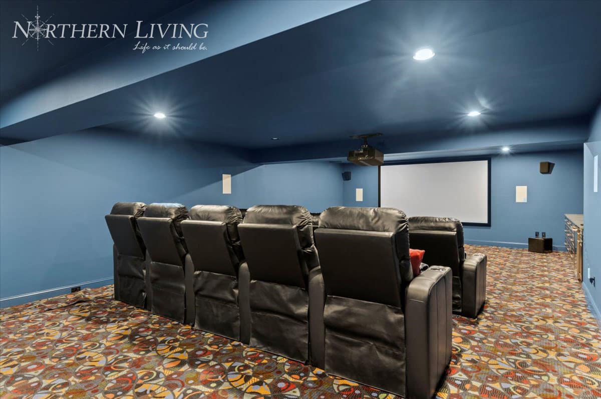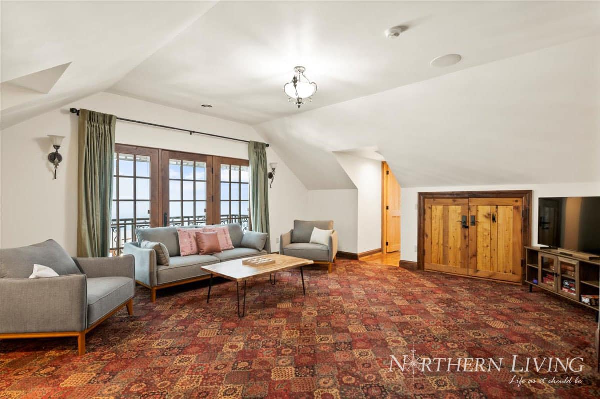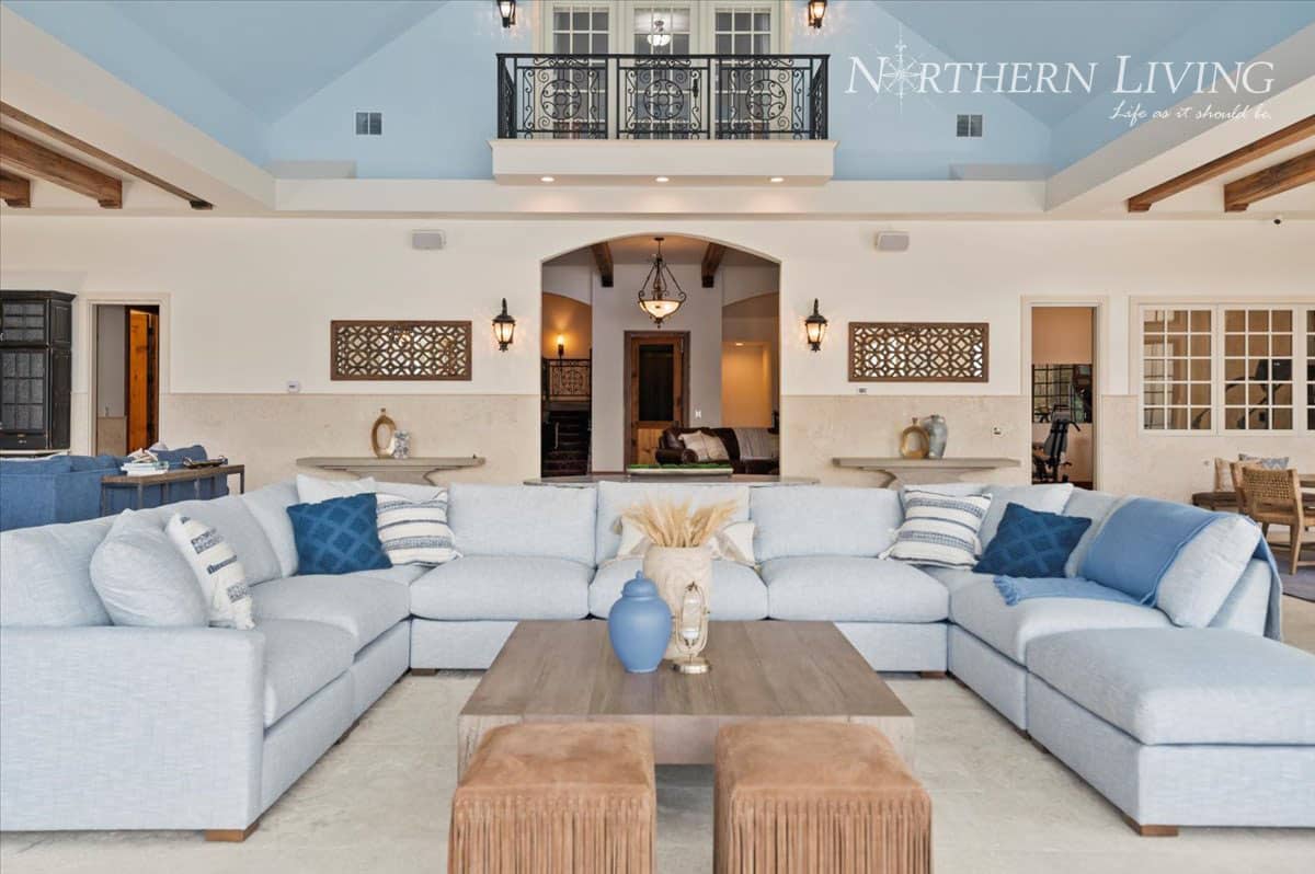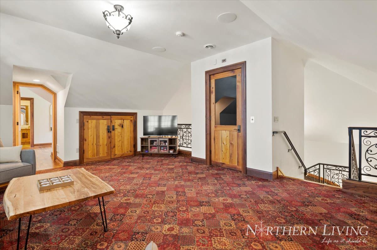 The lake level is the perfect place to spend the day making memories. As you walk down the stairs, you will find a ping pong, air hockey table, and an additional refrigerator. In the North wing of the lake level, there is a movie theater with a mini fridge, a popcorn machine, candy, and eight reclining chairs. As you head to the South wing of the lake level, you will walk through the wine cellar to get to the Adirondack-style pub room, featuring a pool table, jukebox, full bathroom, and living room with a fireplace. The custom-built wooden bar features an ice maker, a wine fridge, a sink, and windows connecting to the outdoor bar so you can serve drinks while lounging outside on the lawn or under the house’s second cabana area.