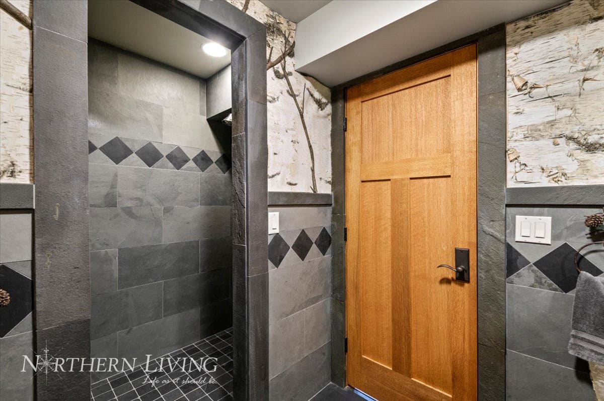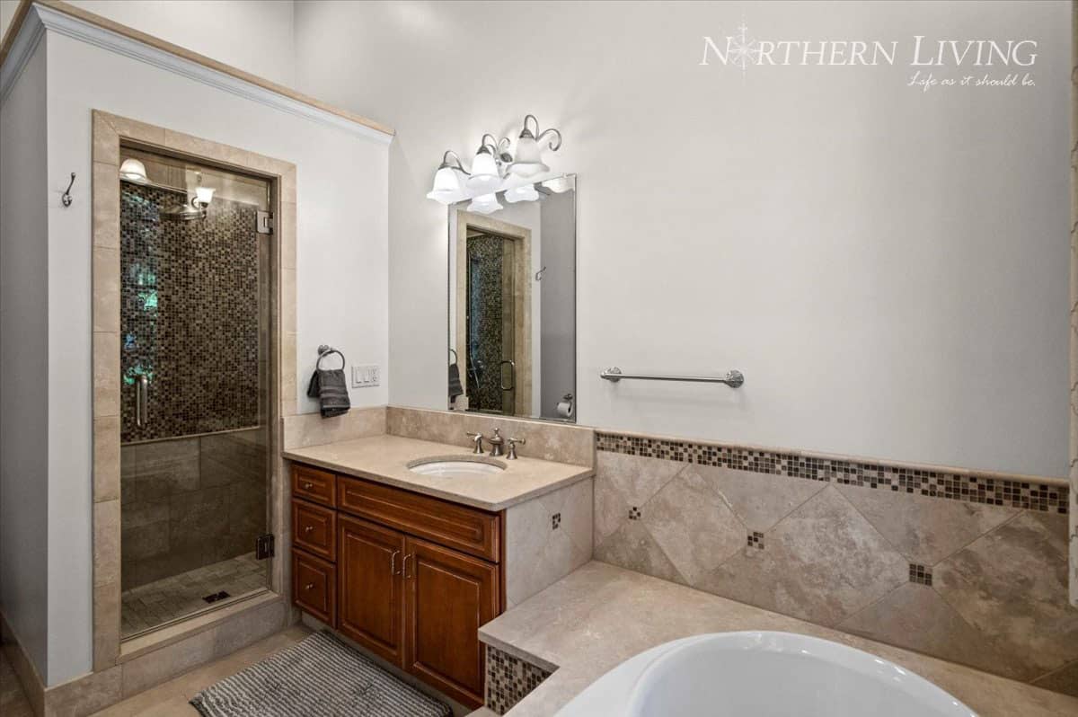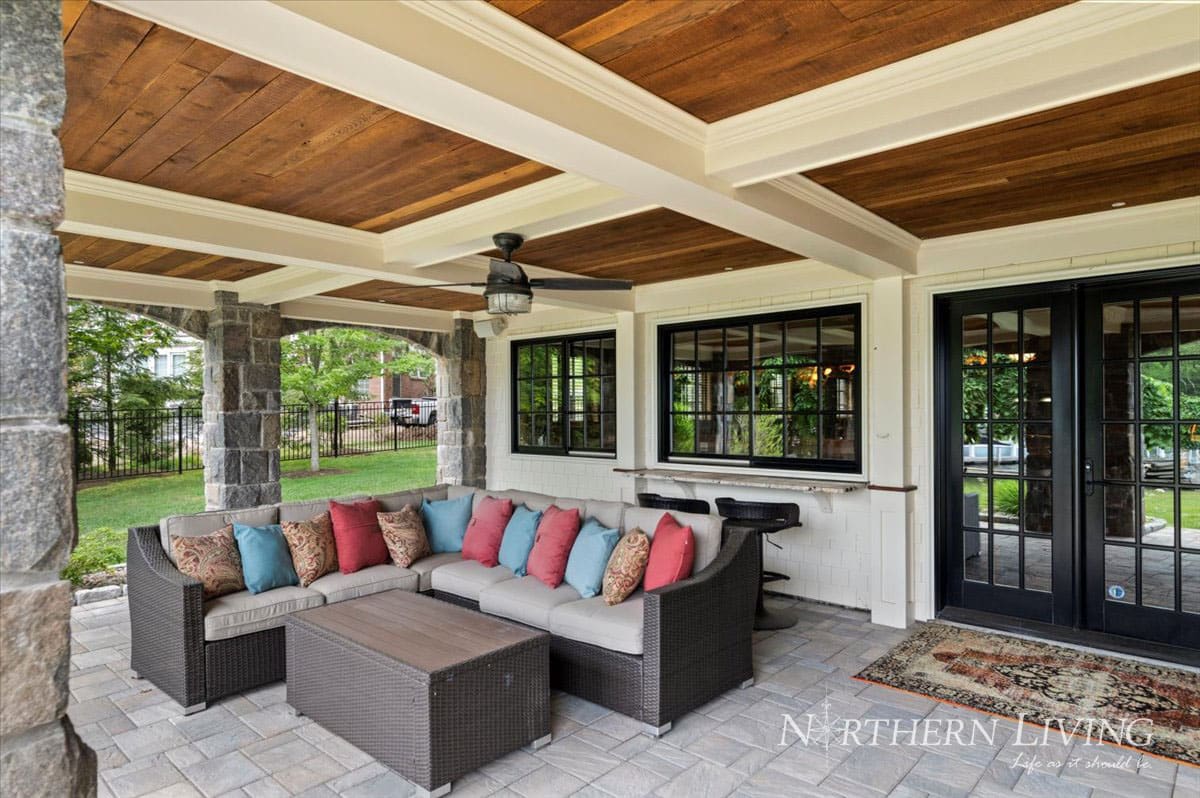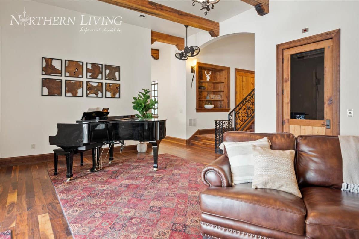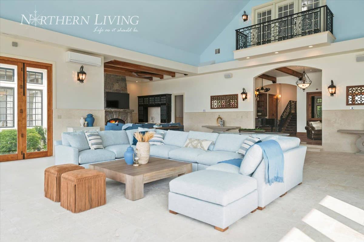 The lake level is the perfect place to spend the day making memories. As you walk down the stairs, you will find a ping pong, air hockey table, and an additional refrigerator. In the North wing of the lake level, there is a movie theater with a mini fridge, a popcorn machine, candy, and eight reclining chairs. As you head to the South wing of the lake level, you will walk through the wine cellar to get to the Adirondack-style pub room, featuring a pool table, jukebox, full bathroom, and living room with a fireplace. The custom-built wooden bar features an ice maker, a wine fridge, a sink, and windows connecting to the outdoor bar so you can serve drinks while lounging outside on the lawn or under the house’s second cabana area.