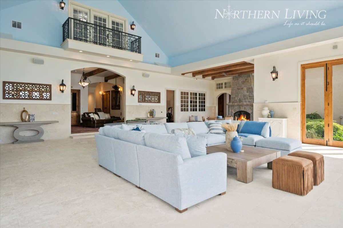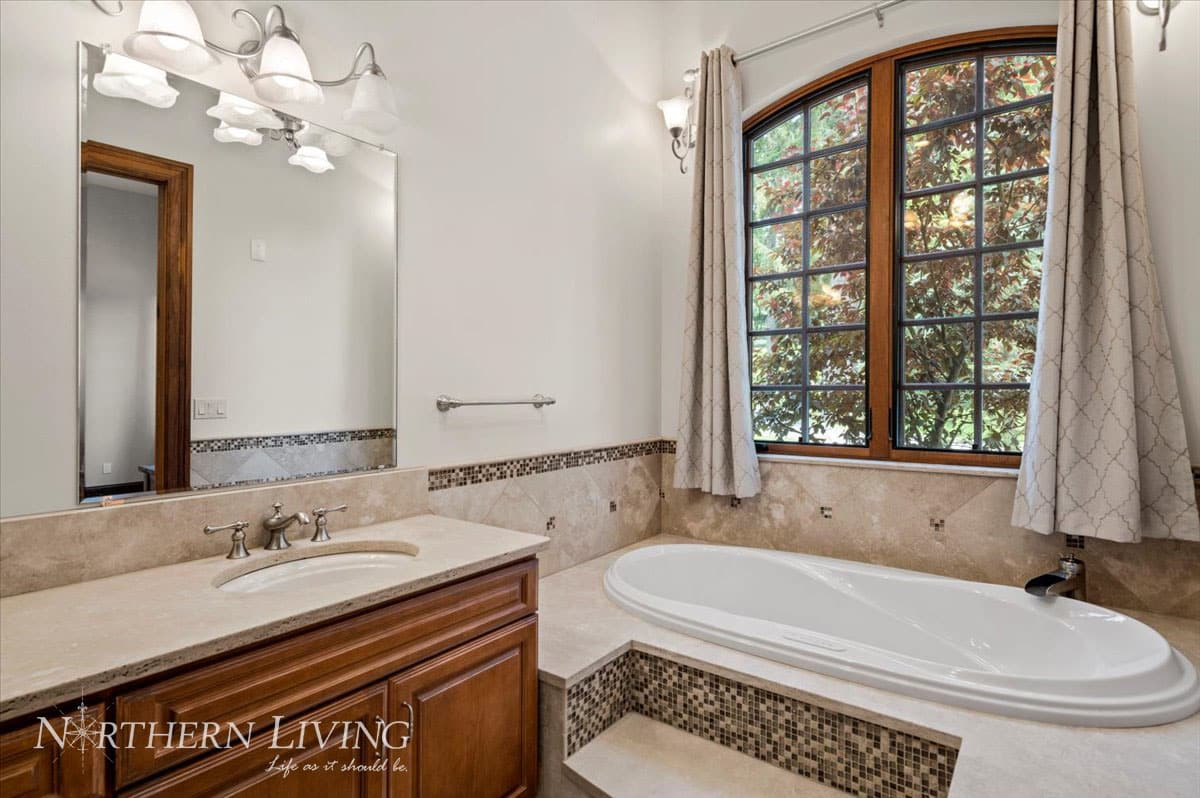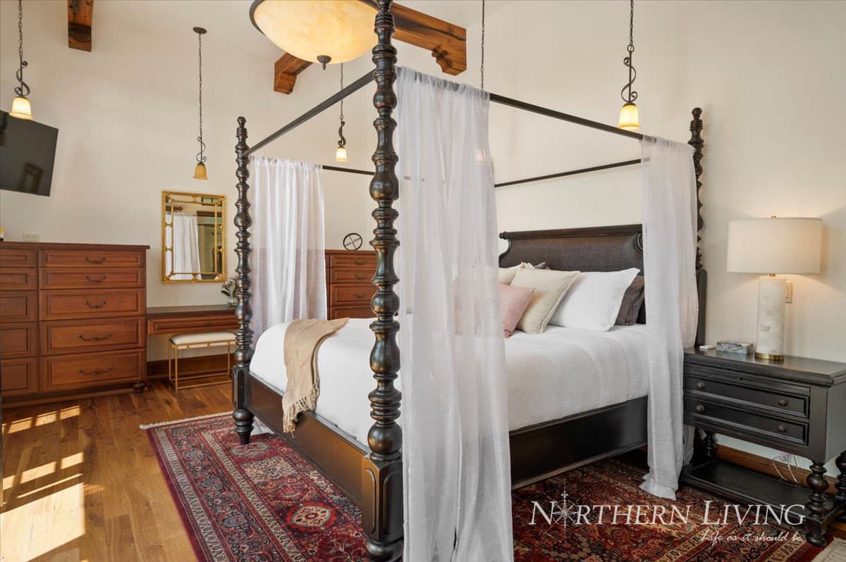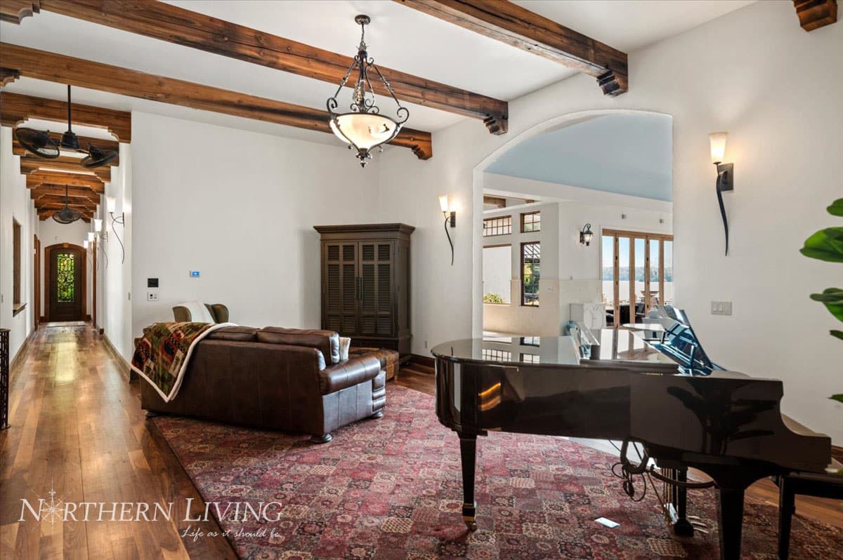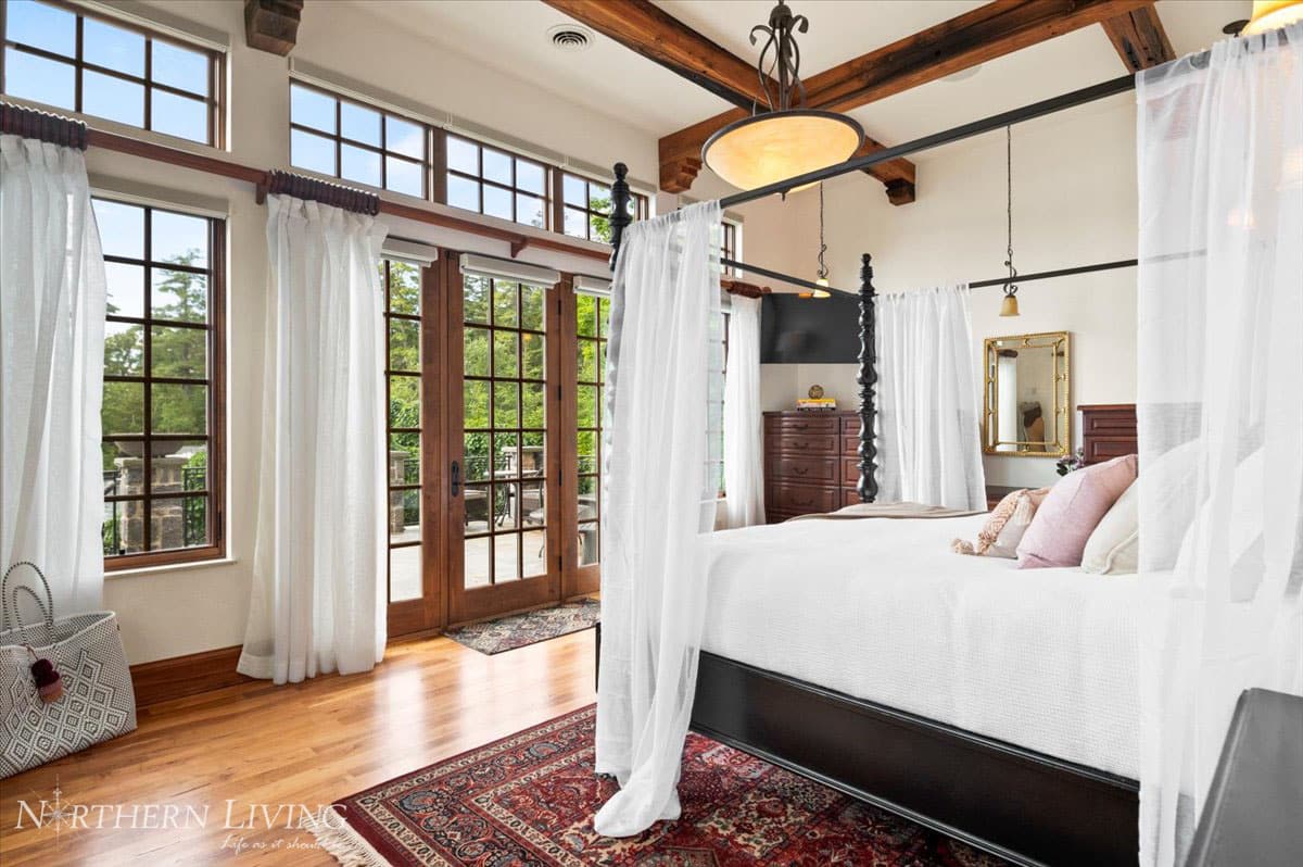 Walking into the main door, you will be in awe of the resort-style architectural design and spacious layout. The main floor features a smaller living room with a piano that leads into a 1,600-square-foot open-concept living room with stunning panoramic views of Lake George everywhere you look. This expansive room boasts three distinct living areas: an oversized sectional with two bar tables overlooking the lake, a cozy TV area with a fireplace and wet bar with an ice maker and wine fridge, and a round dining table for six alongside another stone fireplace. Off of this room is the exercise room with a stair climber, rogue air bike, and more. Walking through the arched entry into the kitchen, you will find a dining room table with 8, a breakfast nook with 6, a wood-burning fireplace, and perfect views as you cook up your favorite meal. This gourmet kitchen has a 6-burner range, two dishwashers, two sinks, reverse osmosis filtered water, a large center island, a wine rack, and a TV. From here, you walk out onto the lakeside balcony that runs the entire length of the house and features a cabana, fireplace, BBQ grill, wine fridge, and plenty of seating areas. Next to the kitchen is a half bath. You will find two bedrooms on the main floor’s North wing. One bedroom features a king bed and a full bath, while the other features a queen bed with a full bath. The South wing of the main floor features a queen bedroom with a full bathroom and jacuzzi tub. Attached to this bedroom with its private entrance is another bedroom with a queen-over-queen bunk bed. You will find the laundry room and another full bathroom with a walk-in shower in the hallway. The last bedroom on the main floor is the master king, with a four-poster bed, floor-to-ceiling windows, a walk-in closet, a walk-out balcony with furniture, and a primary bathroom with a double vanity and walk-in rain shower.
