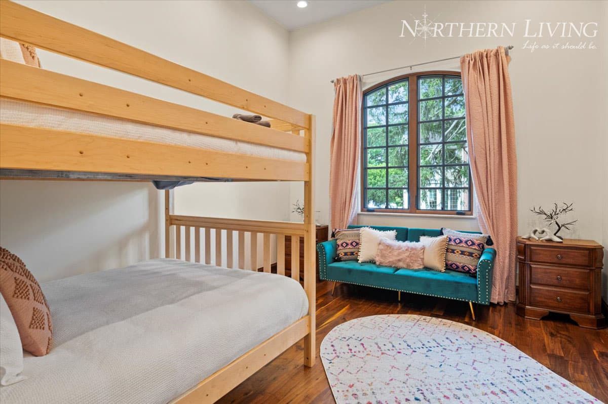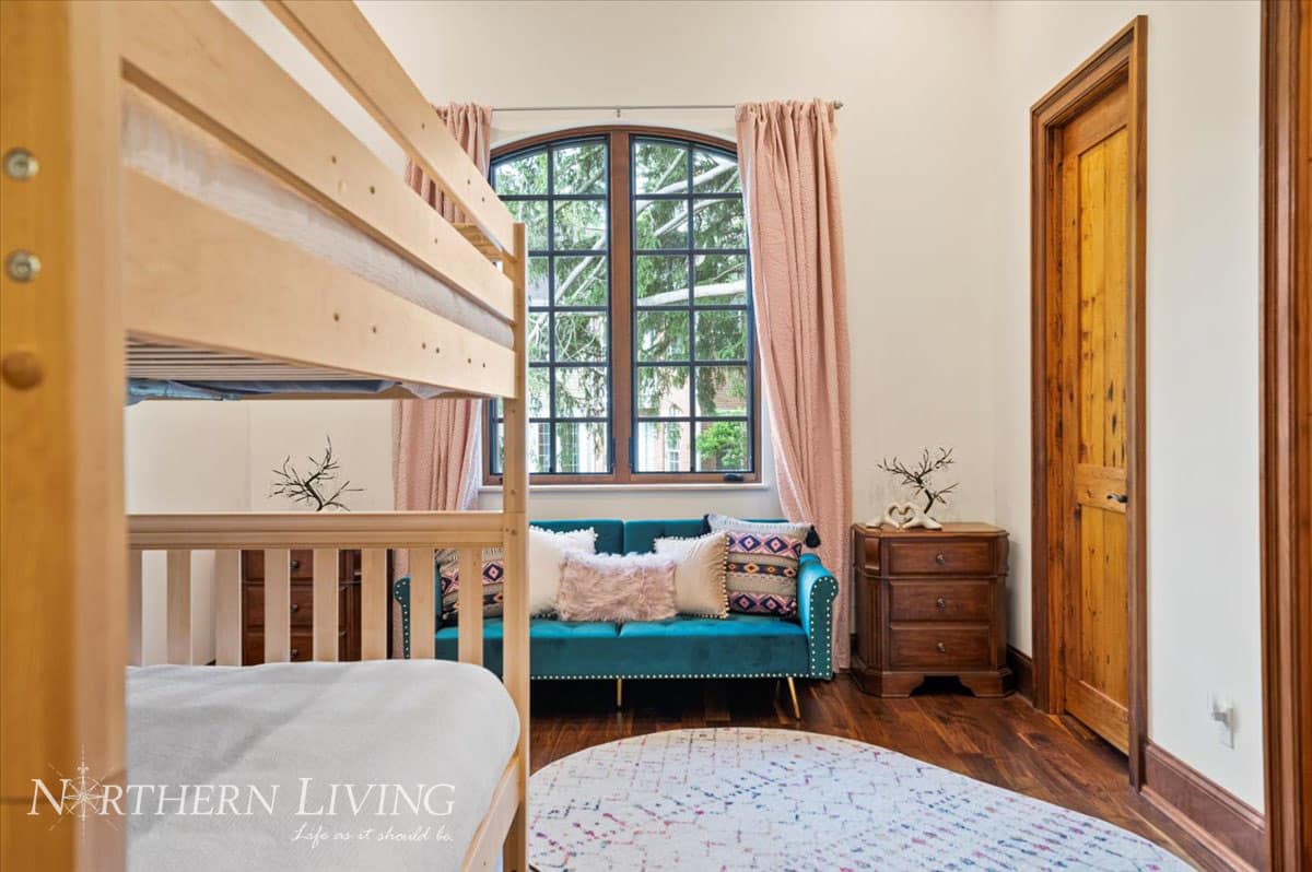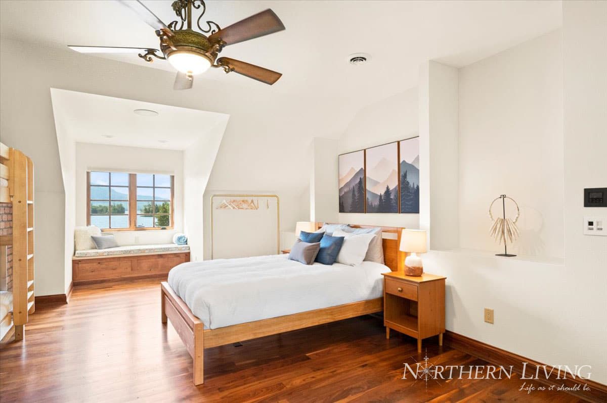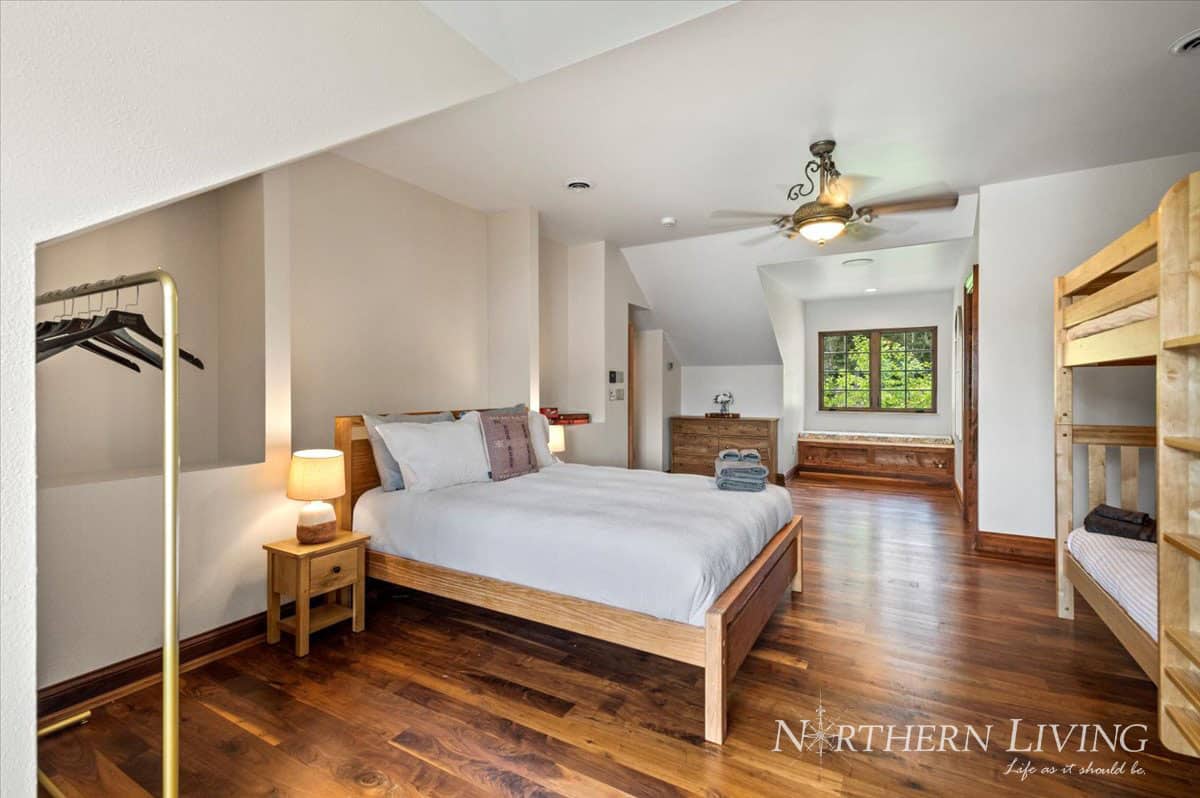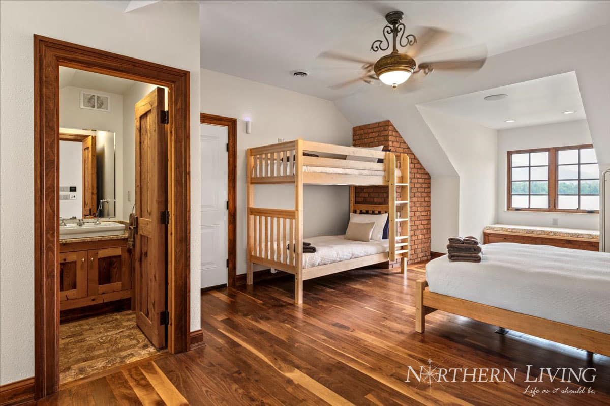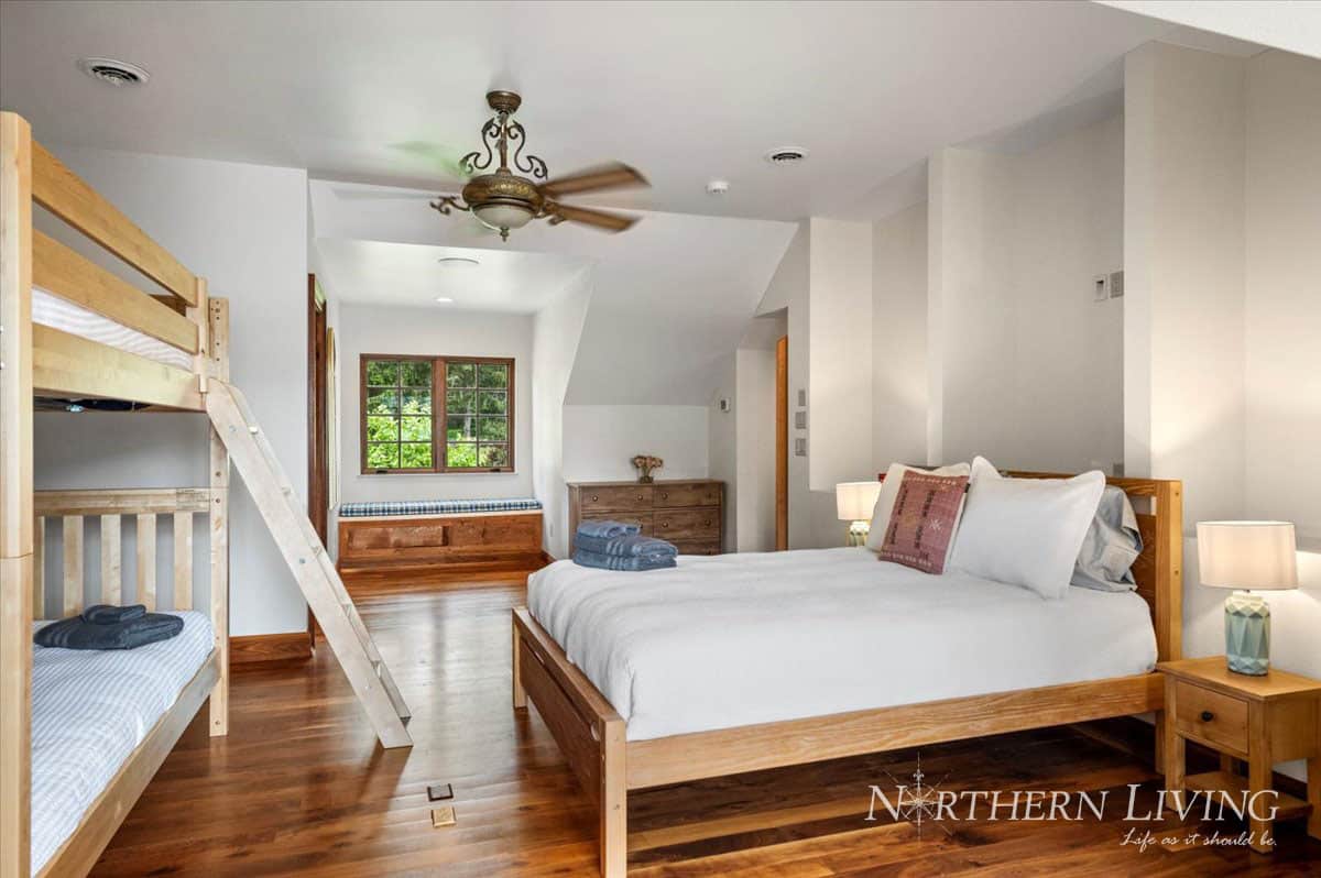 The upstairs of this Bolton Landing vacation home rental features a kid’s den with a full-length window overlooking the lake with two bedrooms on either side. Each bedroom features a queen bed, a twin-over-twin bunk bed, a workspace area, and a half bath.