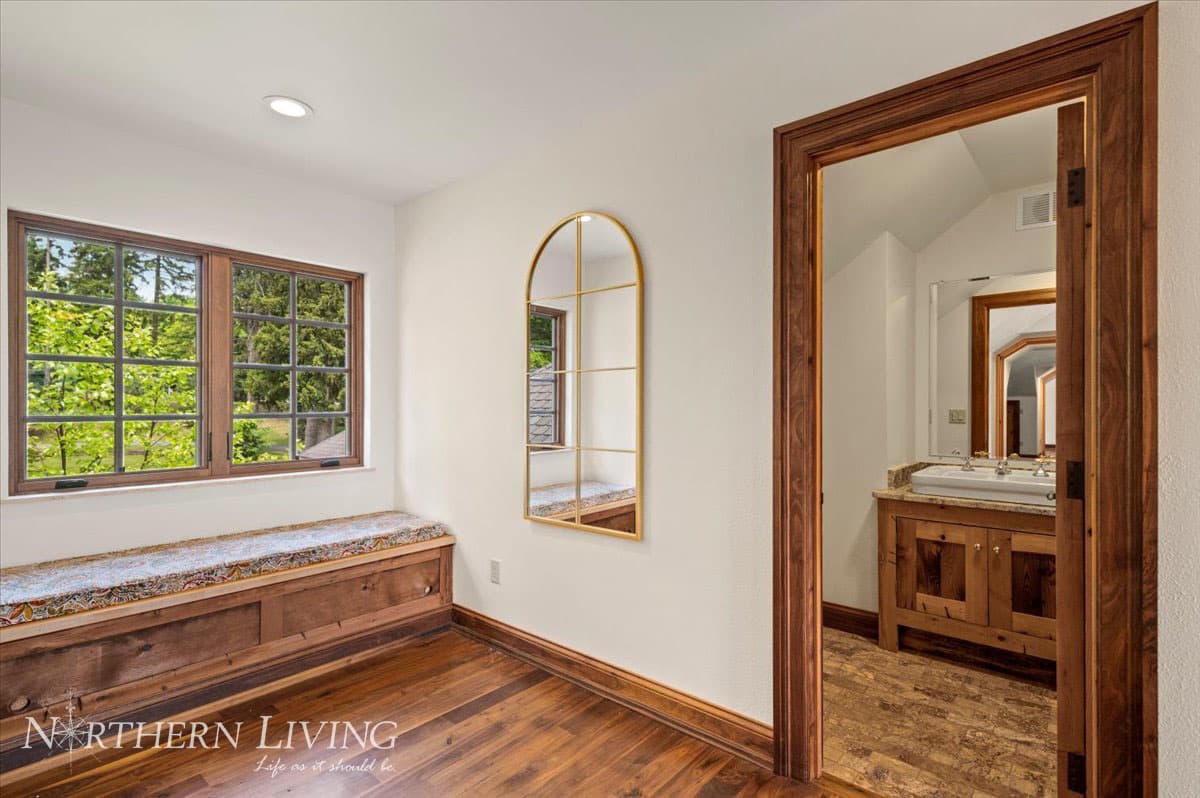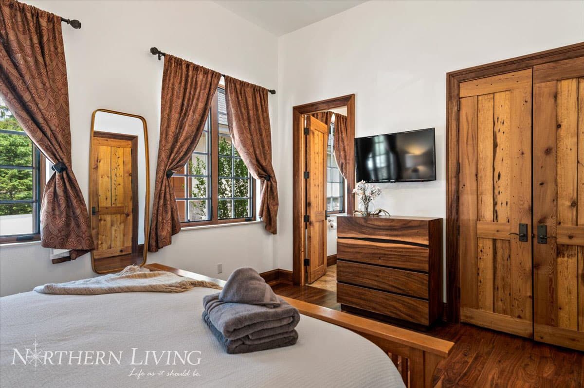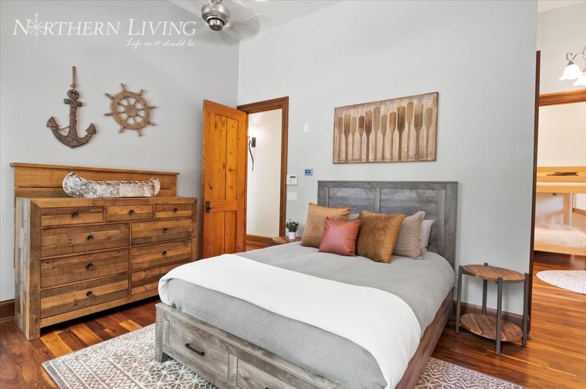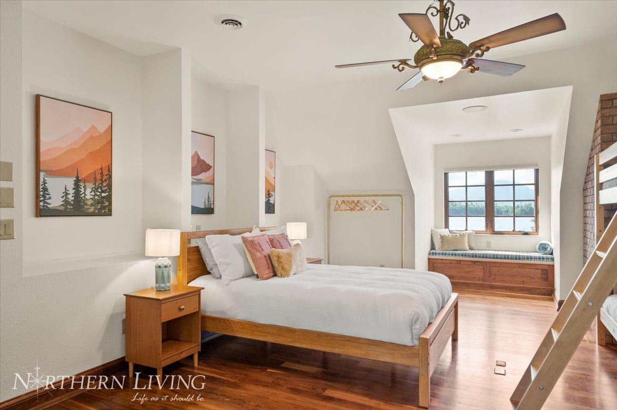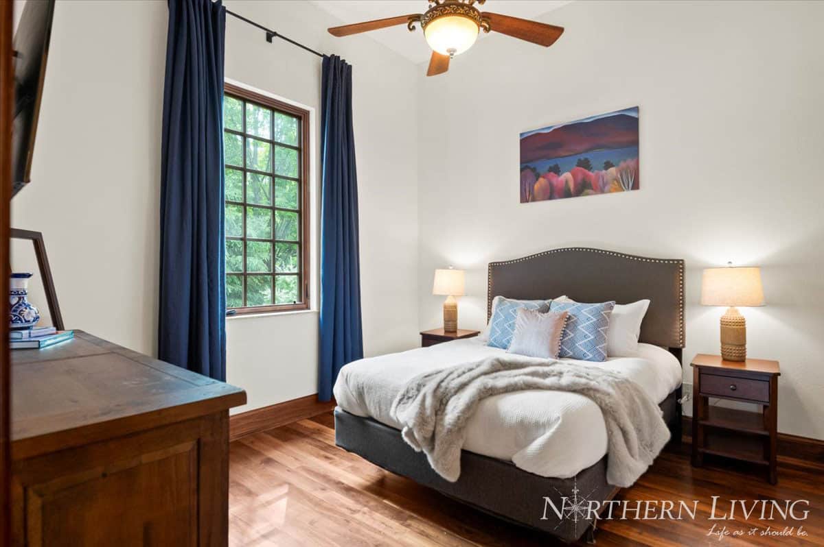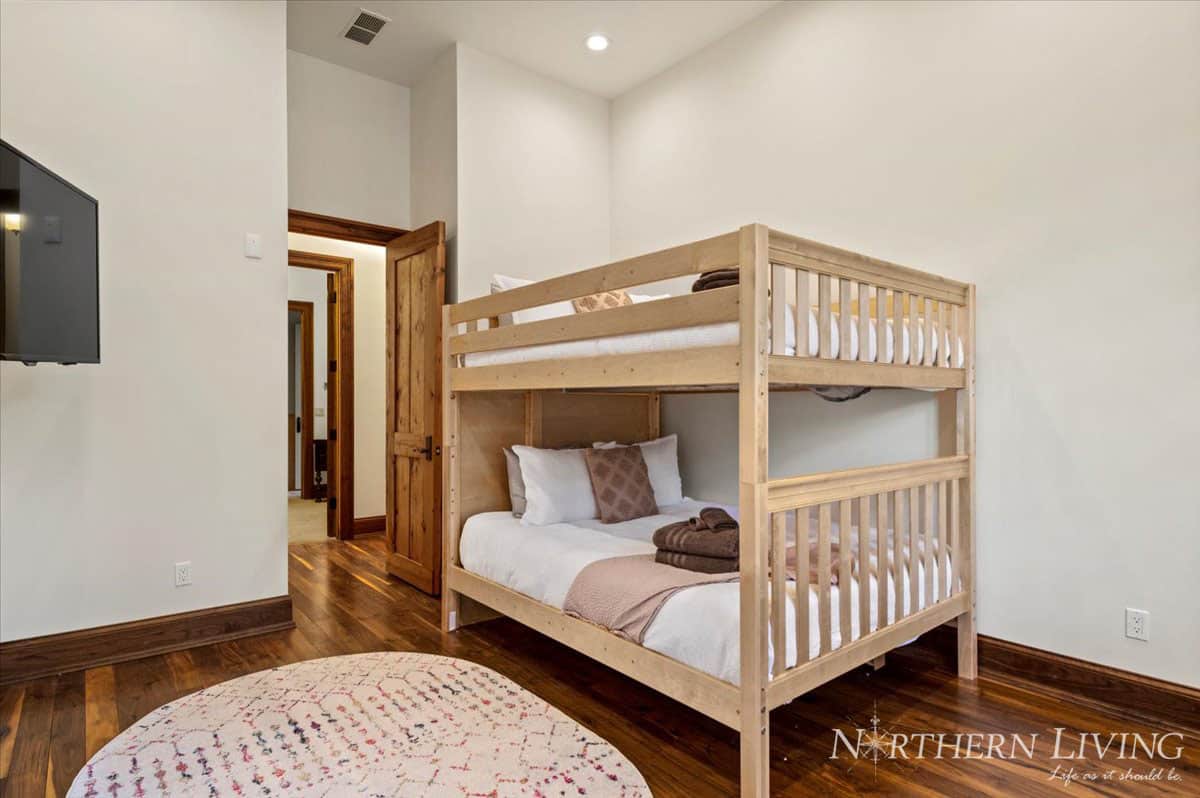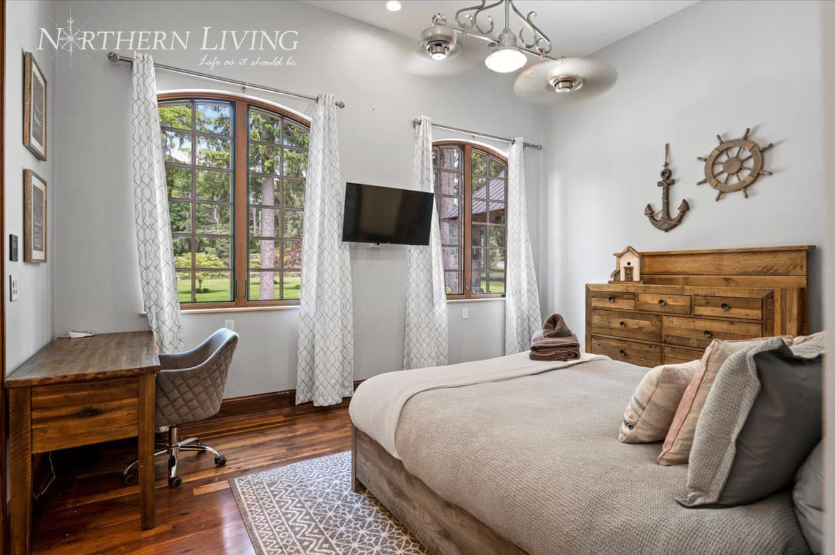 The upstairs of this Bolton Landing vacation home rental features a kid’s den with a full-length window overlooking the lake with two bedrooms on either side. Each bedroom features a queen bed, a twin-over-twin bunk bed, a workspace area, and a half bath.