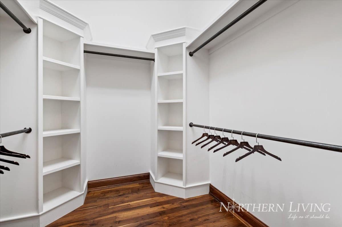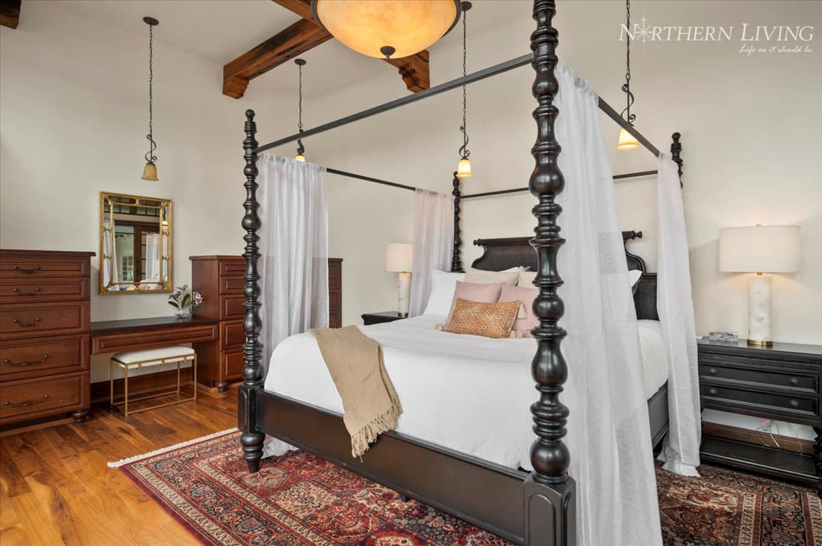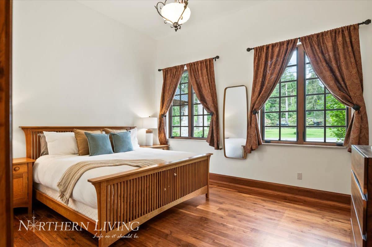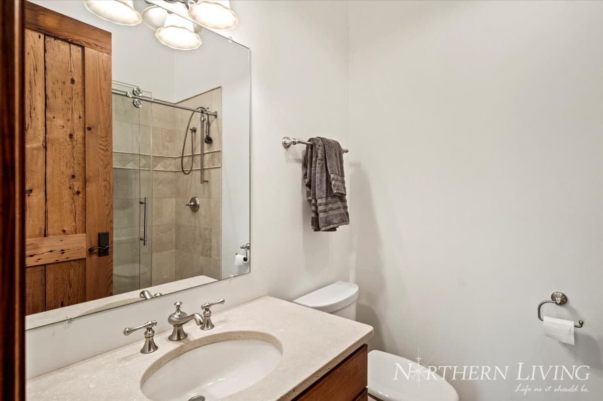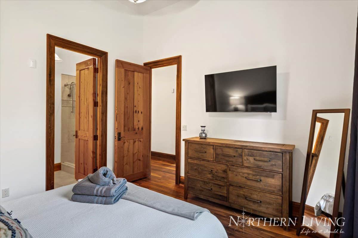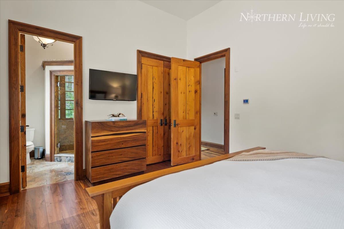 The upstairs of this Bolton Landing vacation home rental features a kid’s den with a full-length window overlooking the lake with two bedrooms on either side. Each bedroom features a queen bed, a twin-over-twin bunk bed, a workspace area, and a half bath.